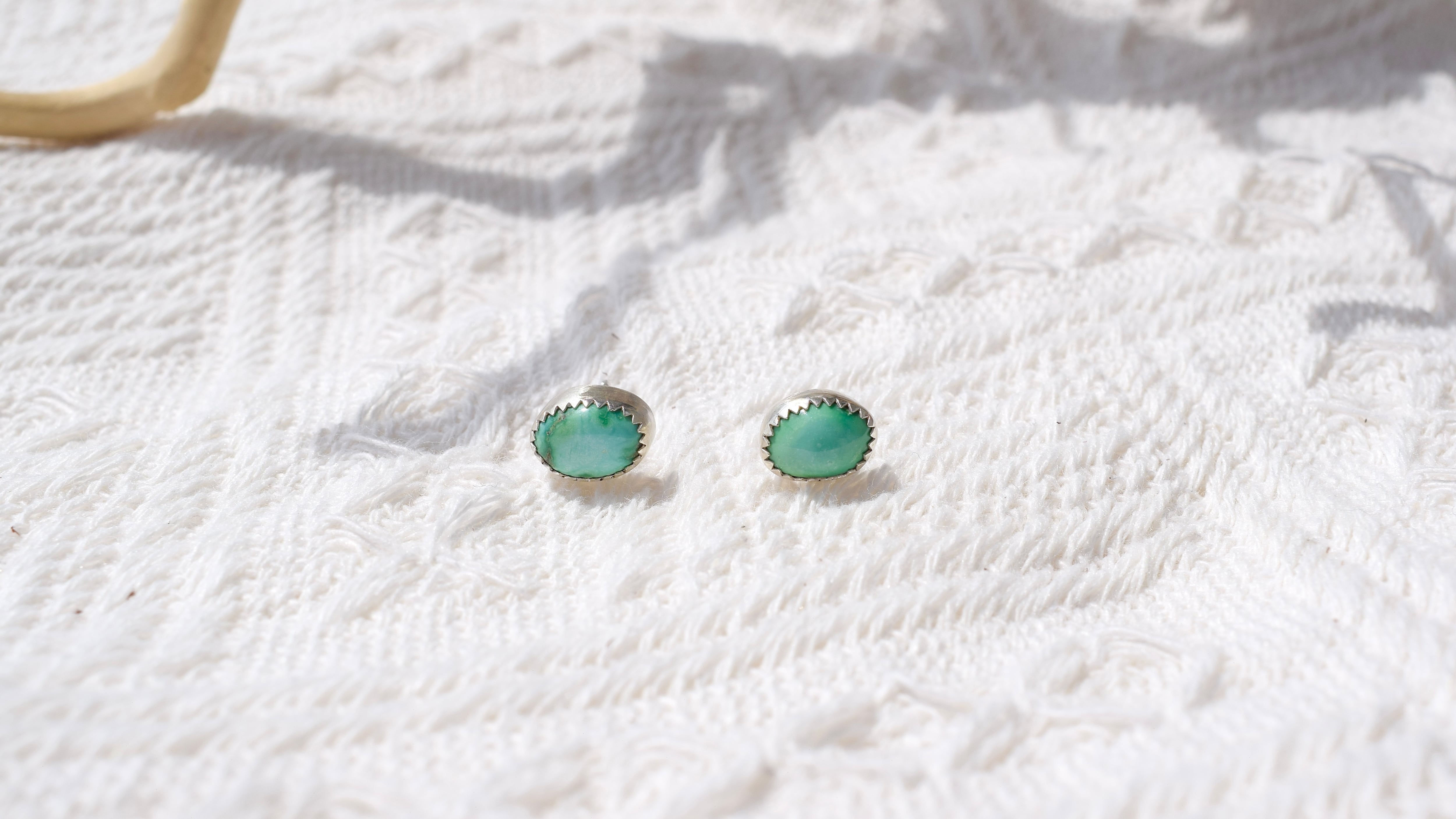 鮮やかなエメラルドバレーターコイズを使用した、控えめながらも存在感のある可愛らしいデザインのピアスです。